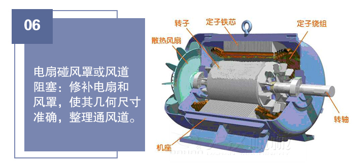 9、電扇碰風罩或風道阻塞:修補電扇和風罩,使其幾何尺寸準確,整理通風道。