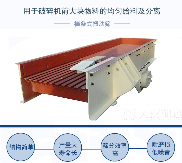 BTS棒條式振動篩用于破碎機前大塊物料的均勻給料及分離,棒條式振動篩特別適用于水電行業(yè)、建筑石料及黑色或有色金屬、礦石粗破前給料和初篩;棒條式振動篩振動給料機采用振動電機為激振源,結構簡單、維護方便;產(chǎn)量大,壽命長,結實耐用。