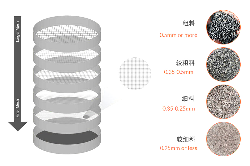 人工手篩費時,勞動強度大,"機械篩分"將篩子按孔徑大小疊在一起,給料放在上面一層篩子上,并加上蓋和底盤,一般疊5-6個篩子,然后放在實驗室振動篩上進行機械振動篩分。通常振動時間為20分鐘,檢測篩分質量時,再用篩機5分鐘,如每分鐘篩下量小0.2%試驗樣量即為合格,對于粗粒,過篩率小于1%即可。為避免損失和延長篩分時間,有時在開始篩分時先用較細的篩子將粉塵篩除。